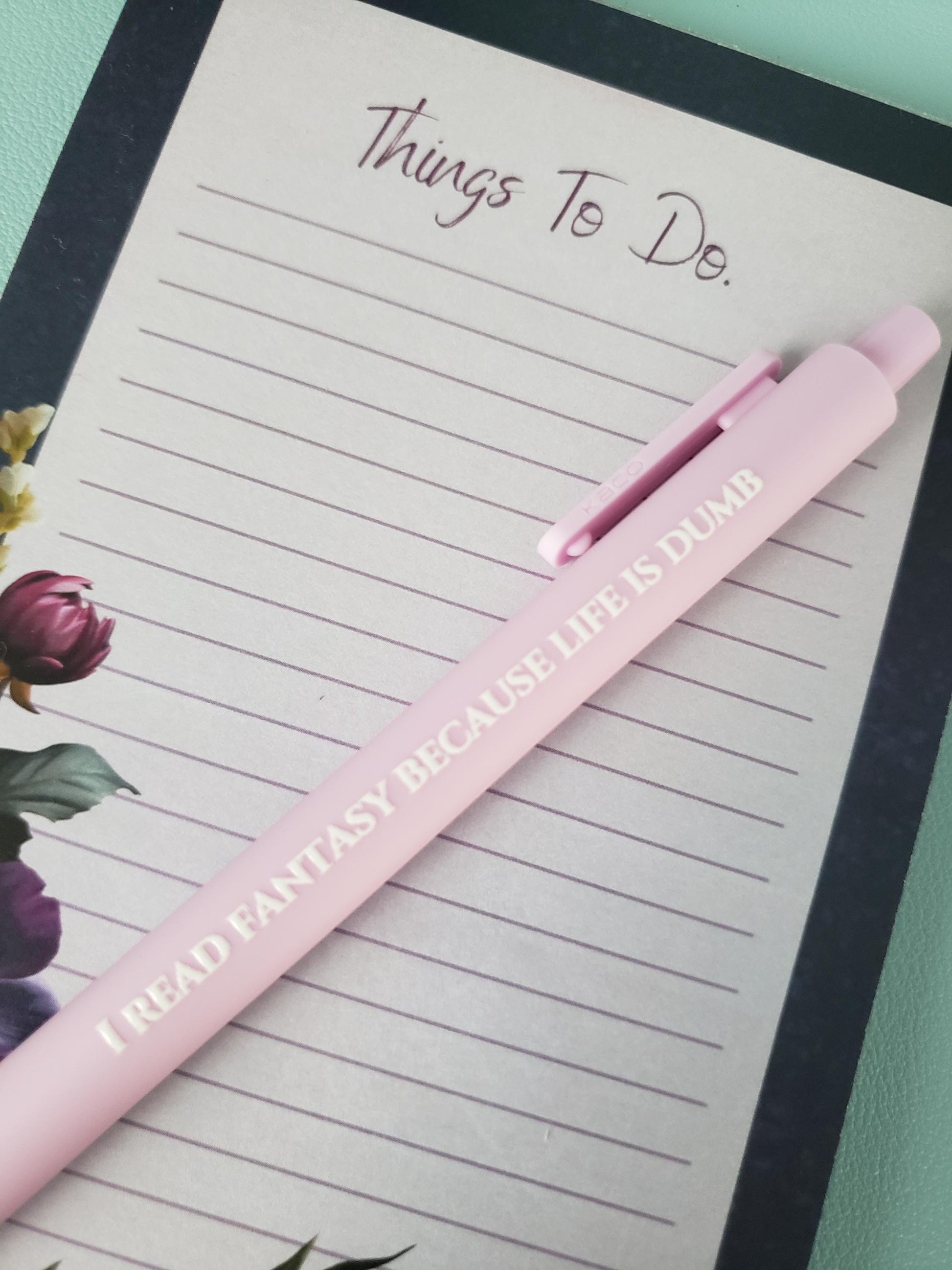 Whether you're emotionally attached to fictional characters, escaping the absurdity of real life through dragons and magic, or simply using your TBR as a form of therapy, we see you. And we made pens for you.